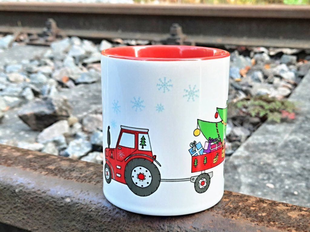Vaše děti si mohou svoje oblíbené kakao nebo čajík vychutnávat v krásném vánočním hrnku s traktorem. Vánoční traktor se stromečkem a dárky jsme namalovali pro všechny malé traktoristy.